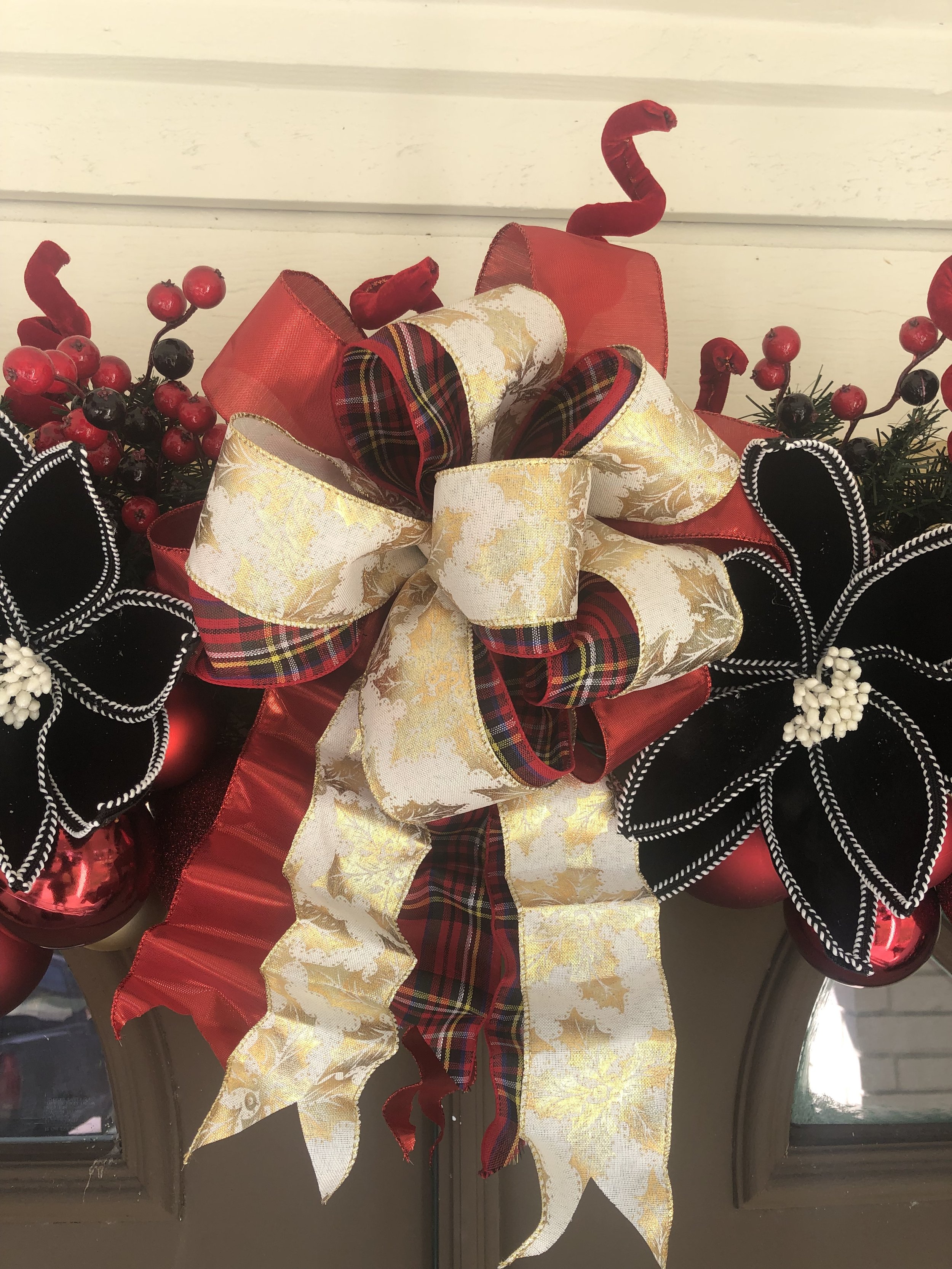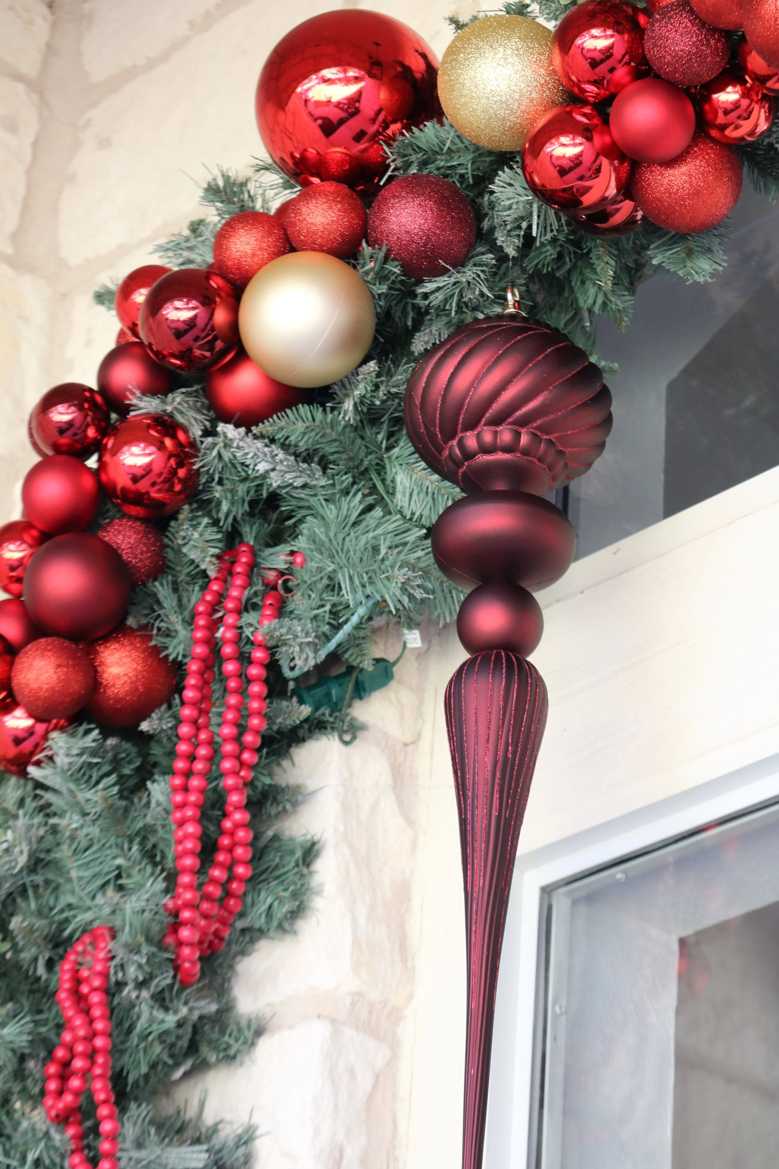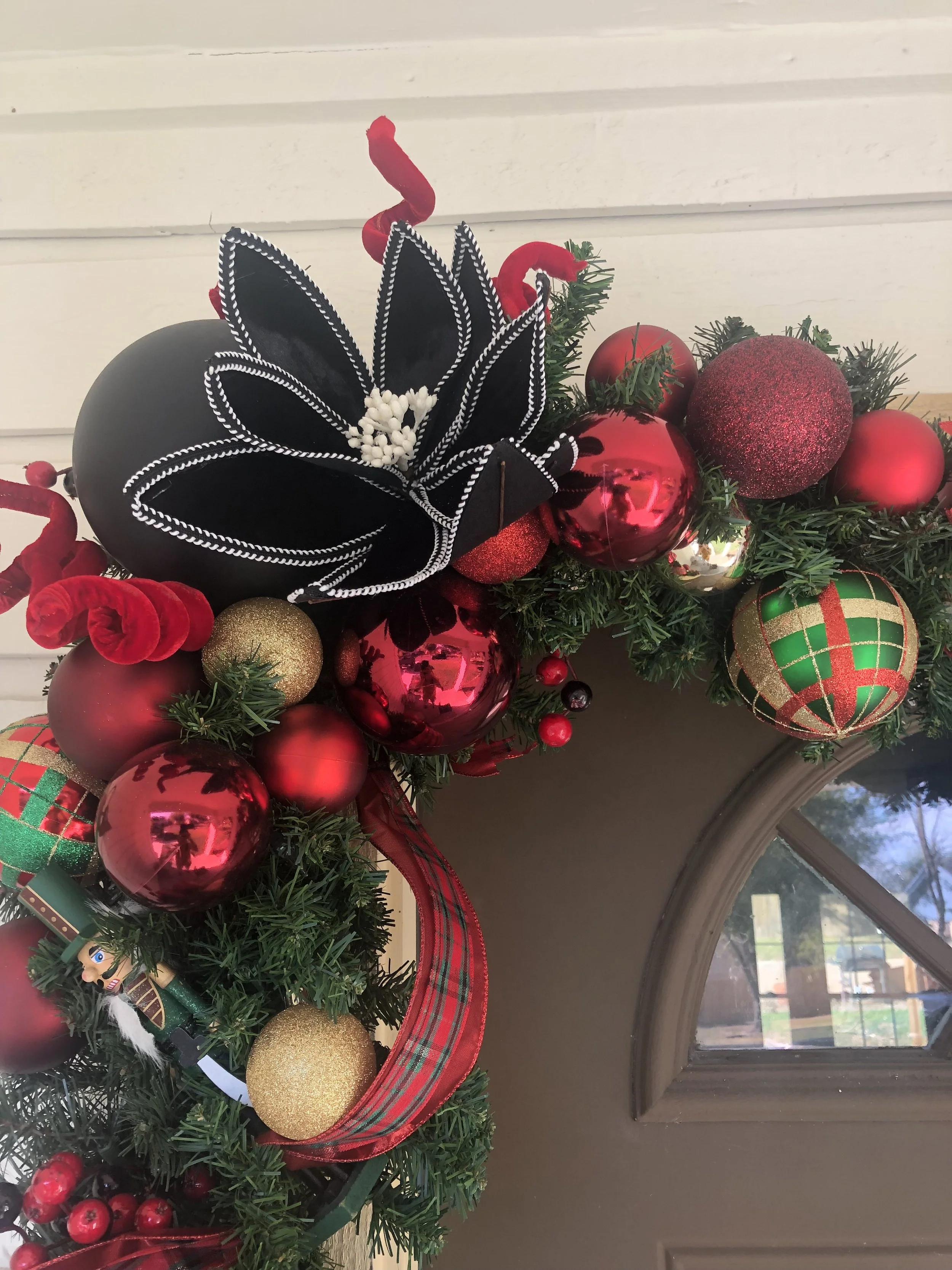 Festive Christmas porch decoration with a green garland adorned with red, gold, and burgundy ornaments, hanging over a wooden front door with a Christmas wreath.