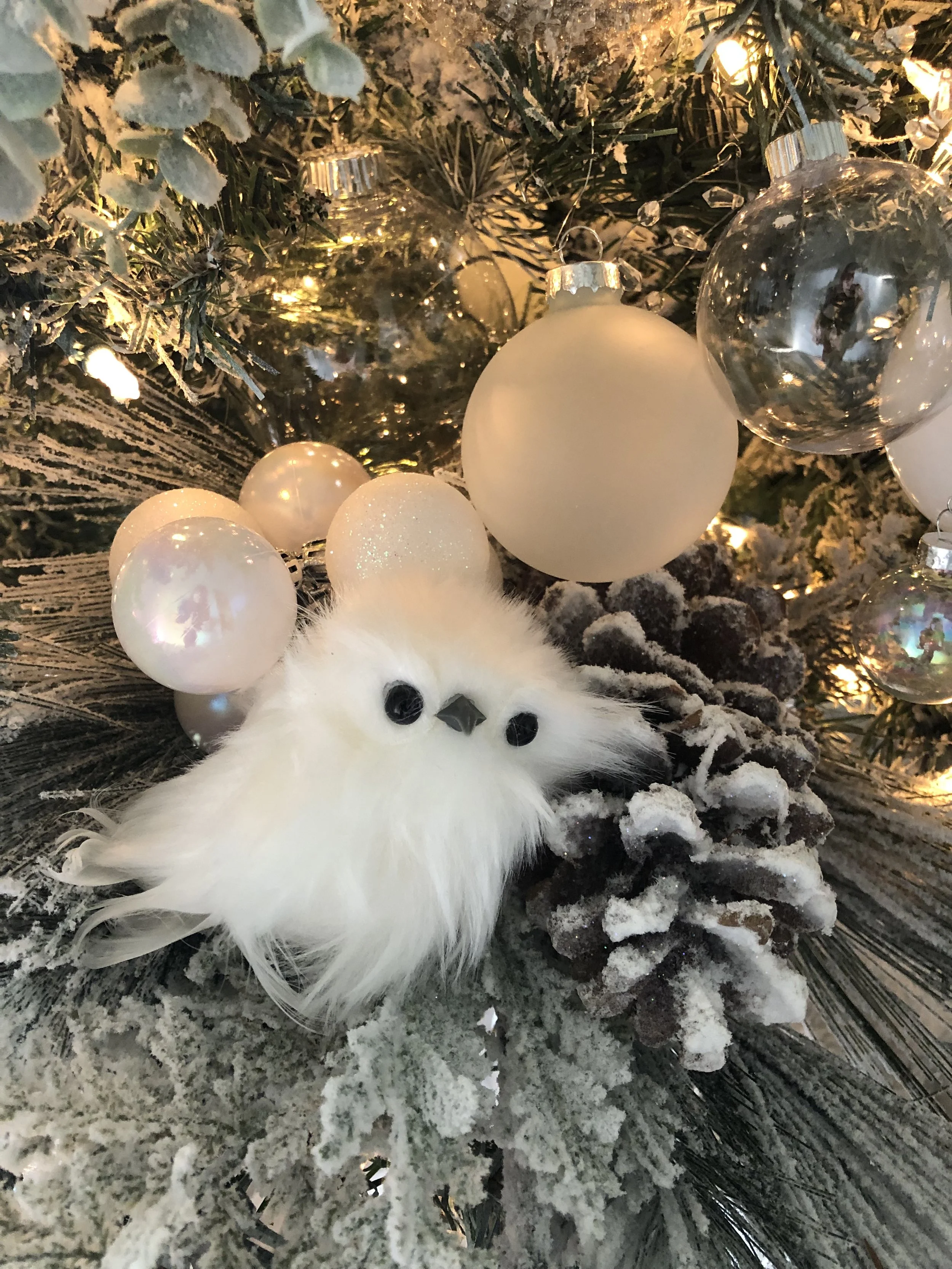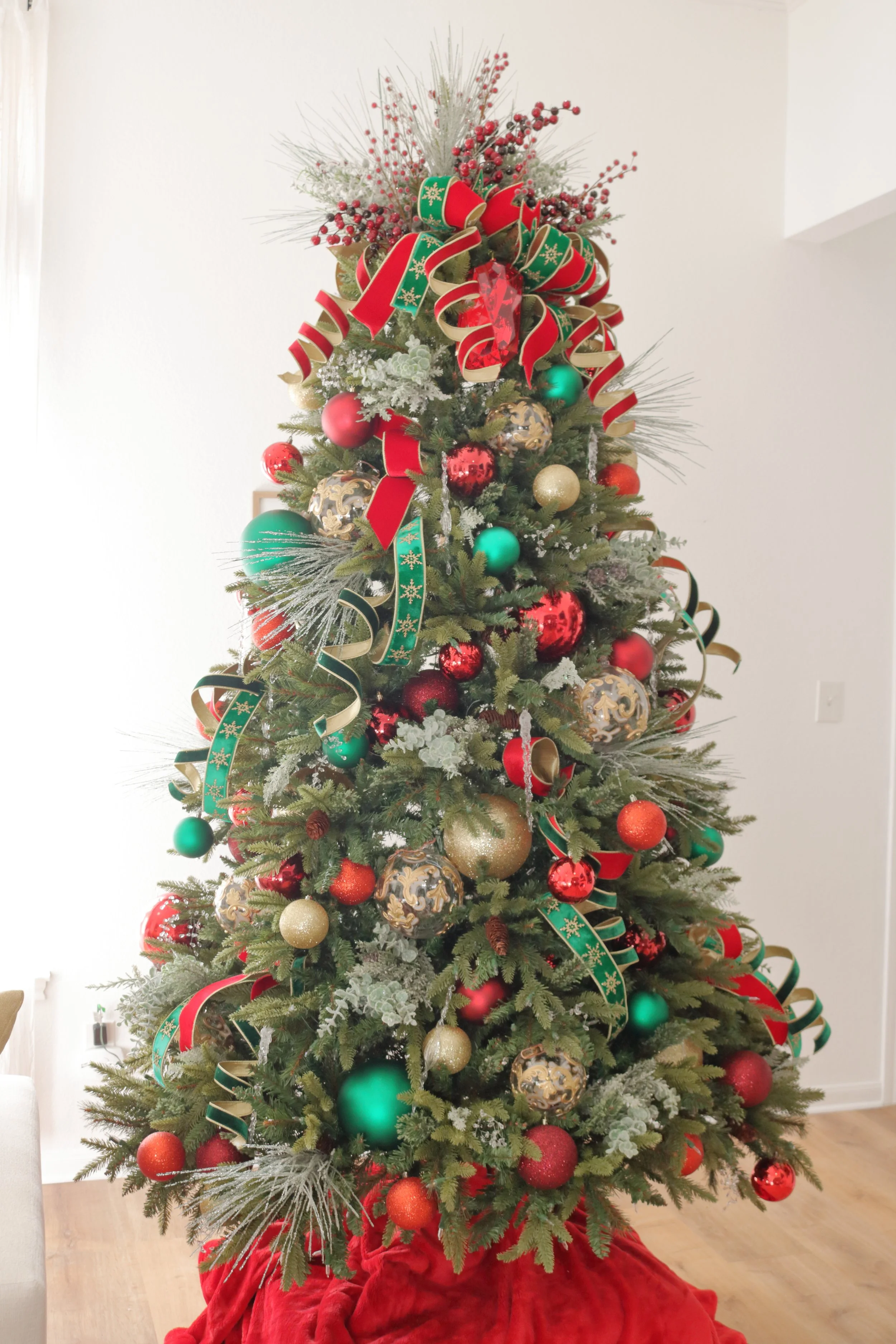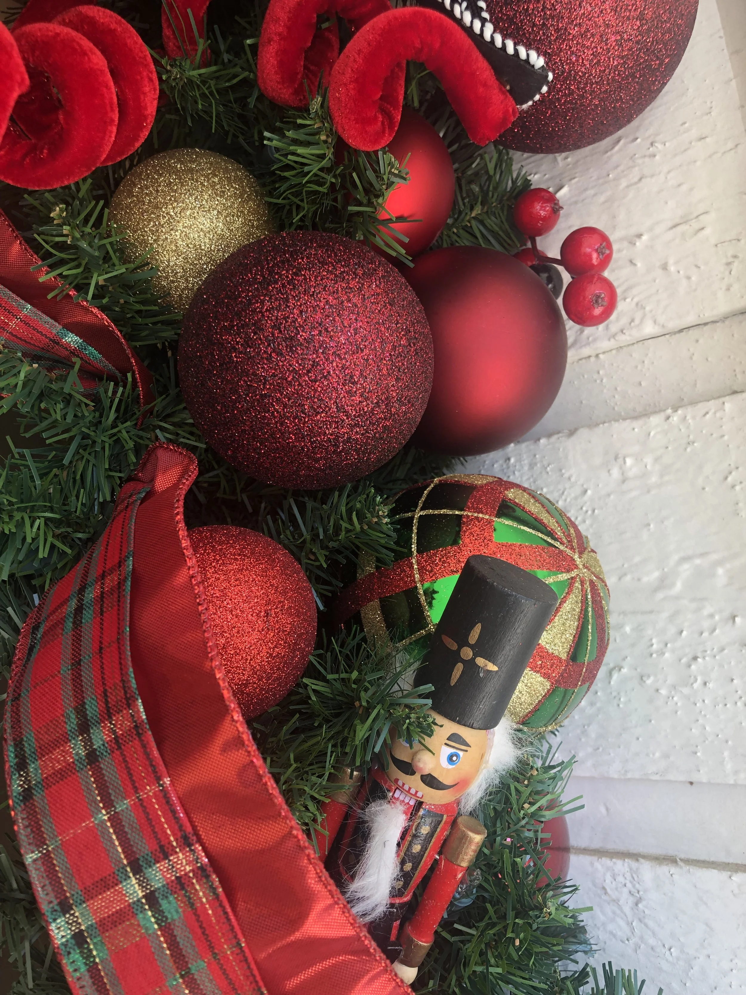 Festive Christmas porch decoration with a green garland adorned with red, gold, and burgundy ornaments, hanging over a wooden front door with a Christmas wreath.